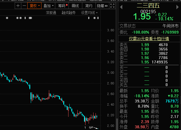 早盘,软件股二三四五股价一字跌停,跌停封单超170万手,最新股价报收1.95元,最新市值仅110亿元。近年来,二三四五股价一路下跌,相比2015年3月的14元多的高点(前复权),已暴跌超80%,相比巅峰时刻的650亿元市值,蒸发超540亿元。