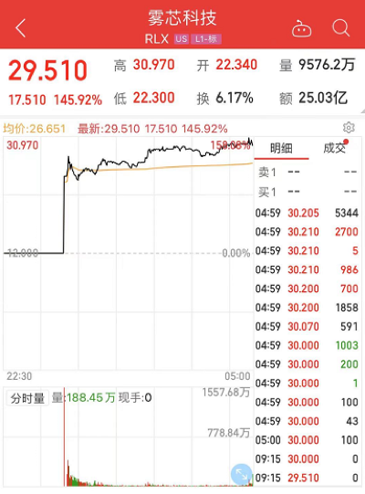 1月22日晚间,电子烟品牌RELX悦刻母公司雾芯科技正式在美国纽交所上市,股票代码为“RLX”,发行价为12美元/ADS。开盘当日便受到爆炒,股价开盘暴涨104%,直接触发熔断停牌。随后,恢复交易的雾芯科技,盘中股价最高涨幅达158%,收盘涨145.9%,市值达到458亿美元,近3000亿人民币。