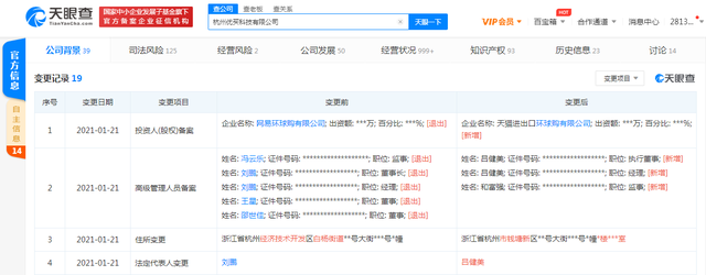 近日,据天眼查APP显示,1月21日,考拉关联公司杭州优买科技有限公司发生工商变更,股东网易环球购有限公司退出,新增股东天猫进出口环球购有限公司,同时,法定代表人变更为吕健美。