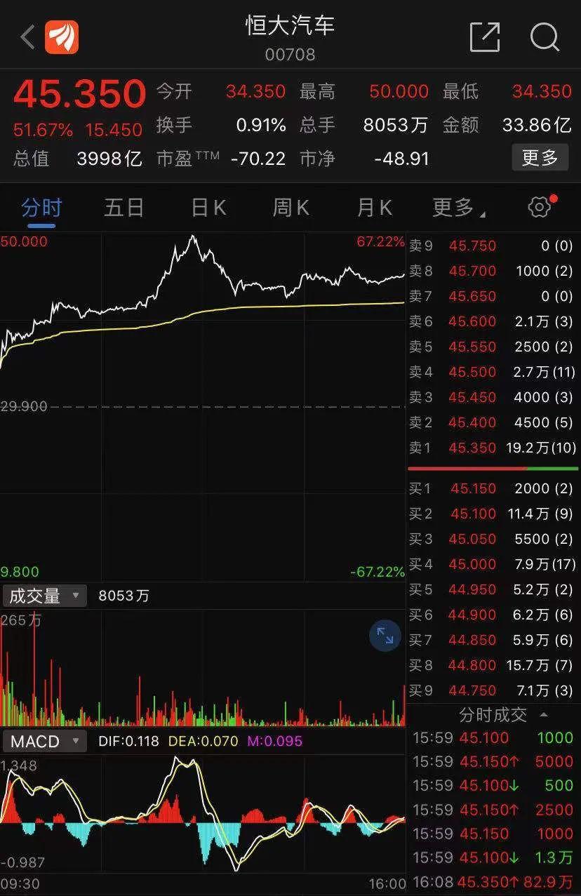 受此消息影响,恒大汽车今天大幅高开,盘中一度涨超67%。根据公告显示,6名投资者以27.3港元/股价格合计认购9.52亿股,截至今日收盘,恒大汽车报45.35港元/股,涨幅51.67%。以此计算,上述6名投资者账面浮盈172亿港元,其中陈凯韵和刘明辉个人分别浮盈20亿港元。