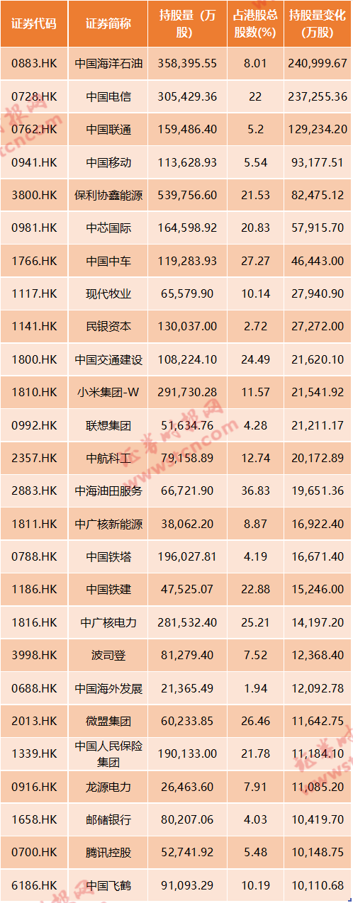 持股增加量排名前三的分别是中国海洋石油、中国电信、中国联通,分别增加了24.1亿股、23.73亿股、12.92亿股。此外,还有23股持股增加量超过1亿股。