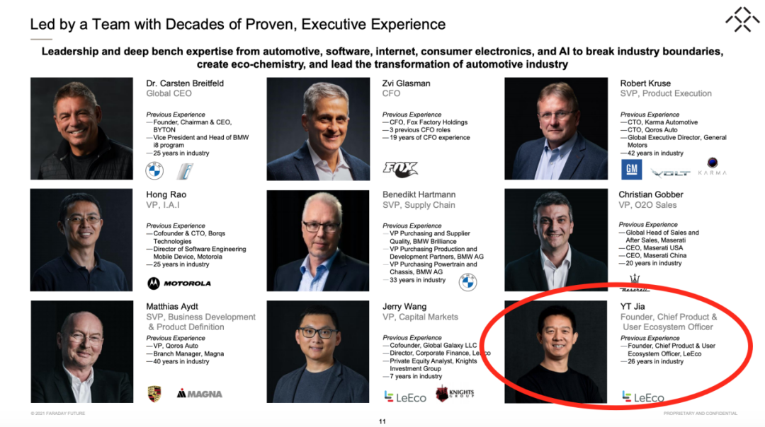 在消息公布后,法拉第未来召开了电话会议,并公布了一份投资人介绍报告。PSAC董事长、联合创始人乔丹·沃格(Jordan Vogel)和法拉第未来的首席执行官毕福康(Carsten Breitfeld)回答了投资者问题。乔丹·沃格表示,在看过65个并购标的后,FF是目前最有竞争力的。他还重点介绍了FF现在的CEO毕福康在宝马等知名汽车企业长达20年的业界经验,并强调FF在过去的四年里已经投入20亿美元用于造车。