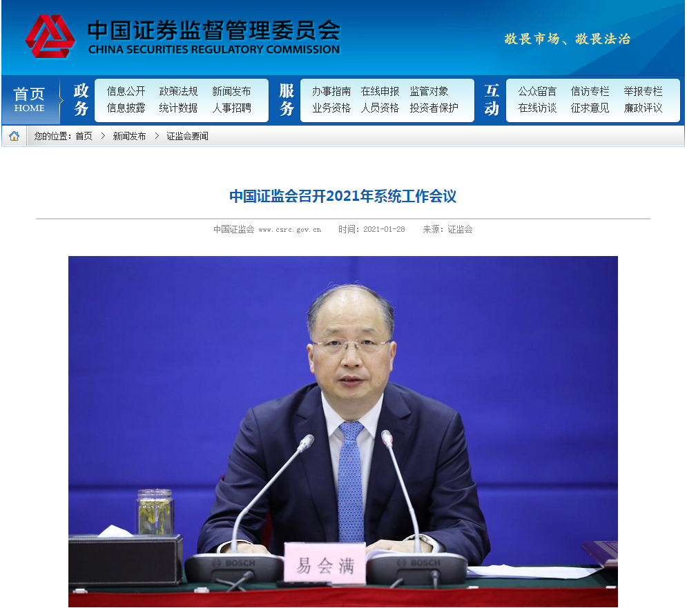 2021年证监会系统工作会议召开证监会部署了2021年资本市场改革重点任务,总结2020年工作,分析研判当前形势,研究部署2021年资本市场改革发展稳定重点任务。证监会党委书记、主席易会满作了题为《把握新发展阶段 贯彻新发展理念 加快推动资本市场服务构建新发展格局》的工作报告。