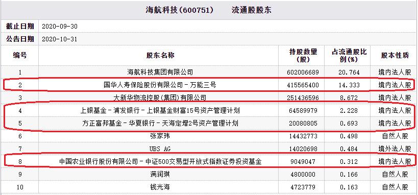 海航科技前十大流通股东中,国华人寿保险股份有限公司-万能三号持有41556.540万股,持股比例为14.333%,为第二大流通股东;上银基金-浦发银行-上银基金财富15号资产管理计划持有6458.998万股,持股比例为2.228%,为第四大流通股东;方正富邦基金-华夏银行-天海定增2号资产管理计划持有2008.081万股,持股比例为0.693%,为第五大流通股东;中国农业银行股份有限公司-中证500交易型开放式指数证券投资基金持有904.905万股,持股比例为0.312%,为第八大流通股东。