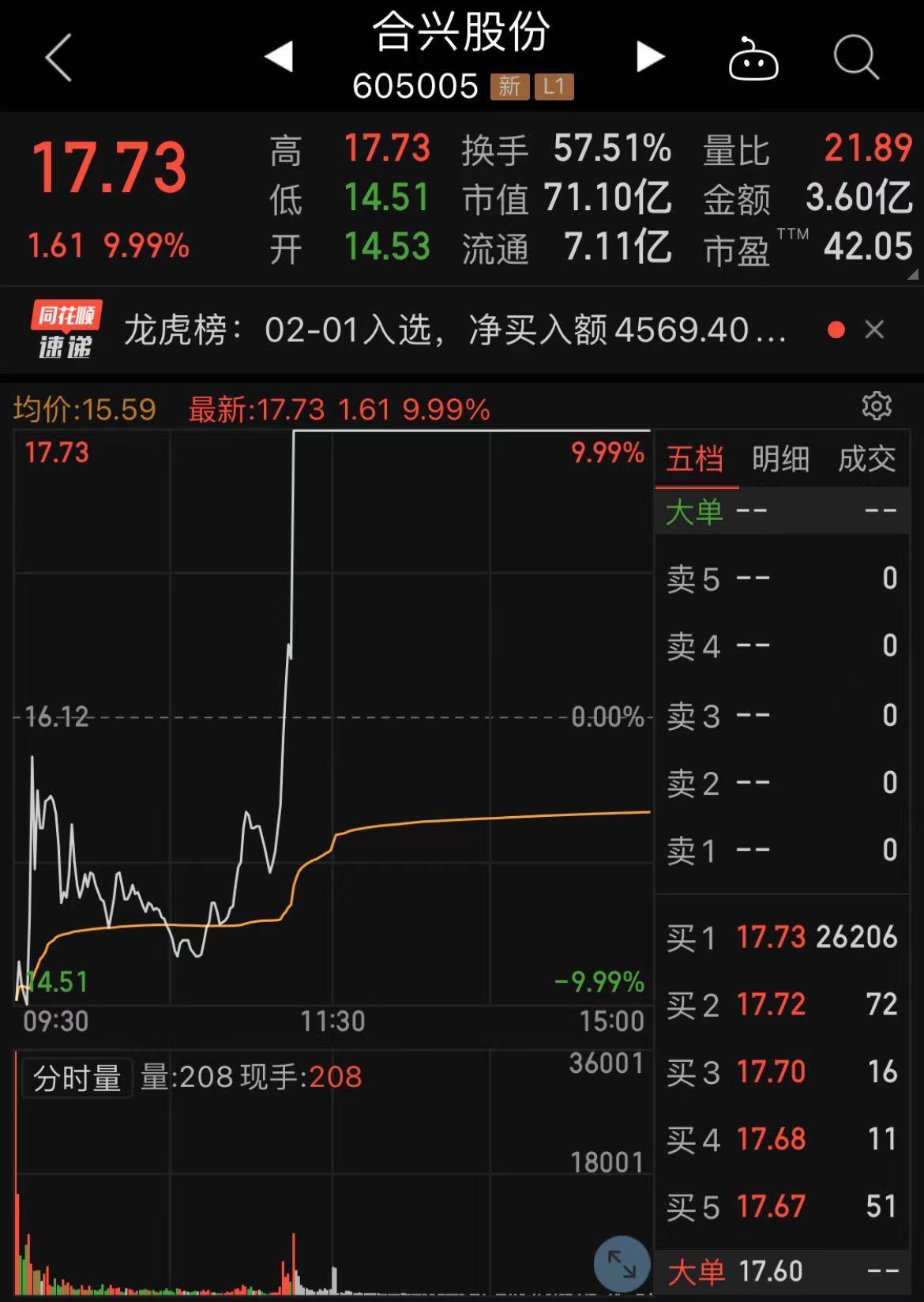 除了“C”字头次新股,上市不足3月的次新股中辰股份、通用电梯、研奥股份、日月明、博迁新材、合兴股份等涨停。其中,合兴股份上演了“地天板”的剧情,该股今日早盘一度跌停,午间11:05开始直线拉升至涨停板。就在上周五该股还一字跌停,在上市至今的10个交易日里,合兴股份不是跌停就是涨停,今天的反转显然是受到了次新股整体的影响。