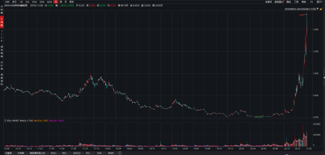 2月3日,保利协鑫能源打下时隔八年多的3.49港元高点;截至2月4日收盘,公司股价为3.26港元,再度冲回800亿港元市值高位。较2020年7月末0.21港元的历史最低点,涨幅超过了14倍。