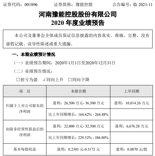 挖贝网1月30日,豫能控股(001896)近日发布2020年业绩预告,预计业绩同向上升。报告期内归属于上市公司股东的净利润26,500万元-36,500万元,比上年同期增长164.62%-264.48%;基本每股收益0.2303元-0.3172元。
