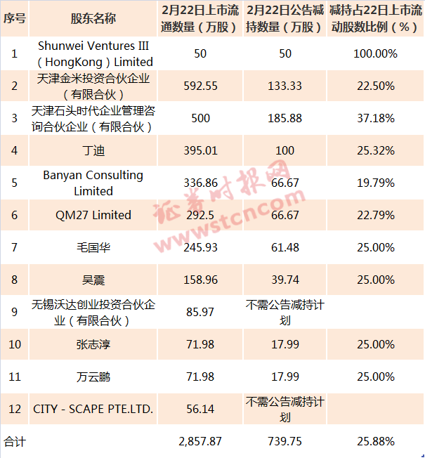 解禁导致股价大跌的阴霾还未消散,减持利空消息又接踵而至。2月22日晚间,石头科技发布一则减持公告称,石头时代、丁迪、高榕、启明、顺为、天津金米、公司董监高毛国华、吴震、万云鹏、张志淳等10名股东,拟减持公司股份合计不超过739.75万股,占公司总股本的比例合计不超过11.10%。按最新收盘价计算,减持股份市值达71.46亿元。