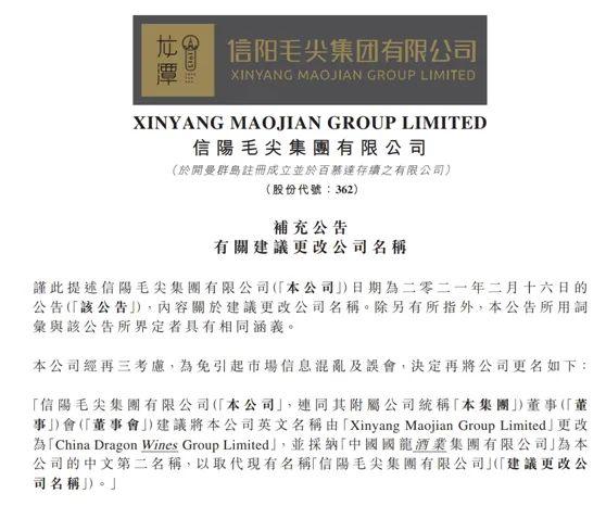 信阳毛尖2月22日晚间公告,经再三考虑,为免引起市场信息混乱及误会,决定再将公司更名如下:将公司英文名称由“XinyangMaojianGroupLimited”更改为“ChinaDragonWinesGroupLimited”,并采纳“中国国龙酒业集团有限公司”为公司的中文第二名称。信阳毛尖2月16日公告,拟采纳“中国国龙茅台集团有限公司”为公司的中文第二名称。
