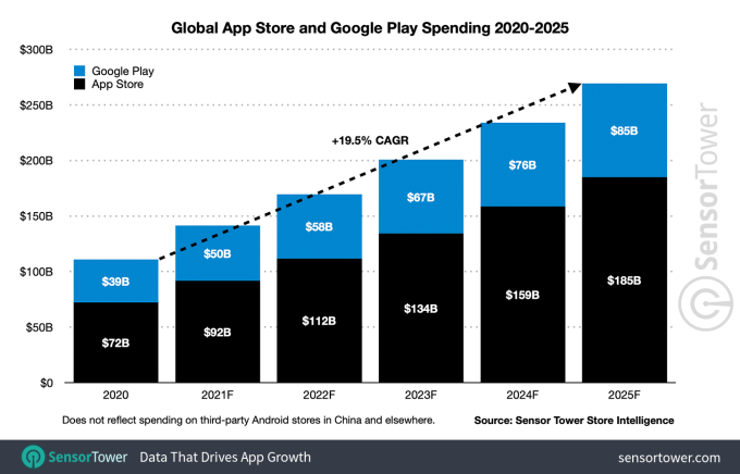 未来5年,全球消费者在移动应用上的支出将达到2700亿美元,是2020年的三倍多。苹果App Store将创造1850亿美元的全球收入,是谷歌Google Play 850亿美元的两倍多。到2025年时,游戏收入在Google Play的占比将达到71%,而App Store为42%。(作者/箫雨)
