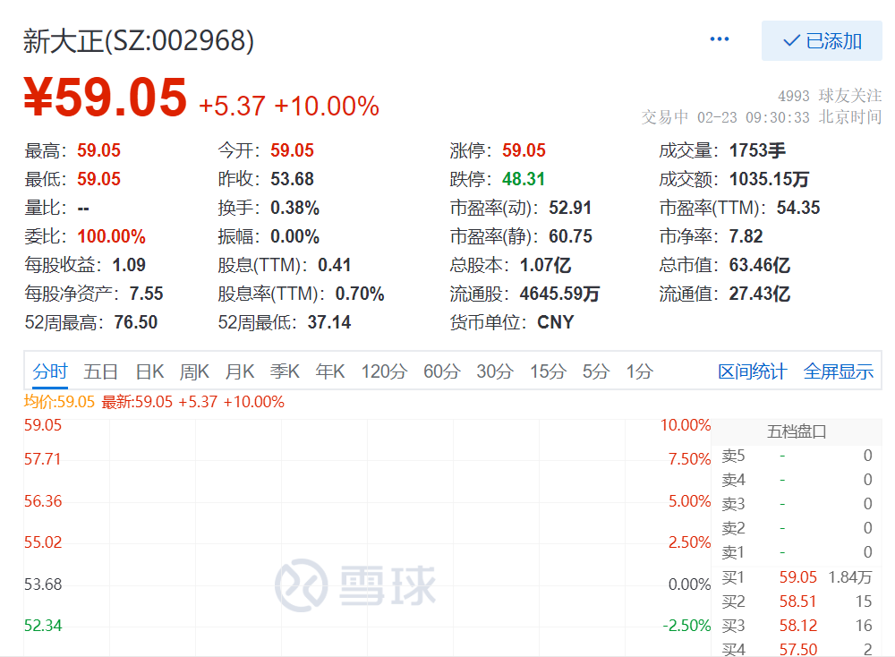 乐居财经讯 王彦杰 2月23日,乐居财经获悉,新大正(002968.SZ)开盘涨停,报59.05元每股。