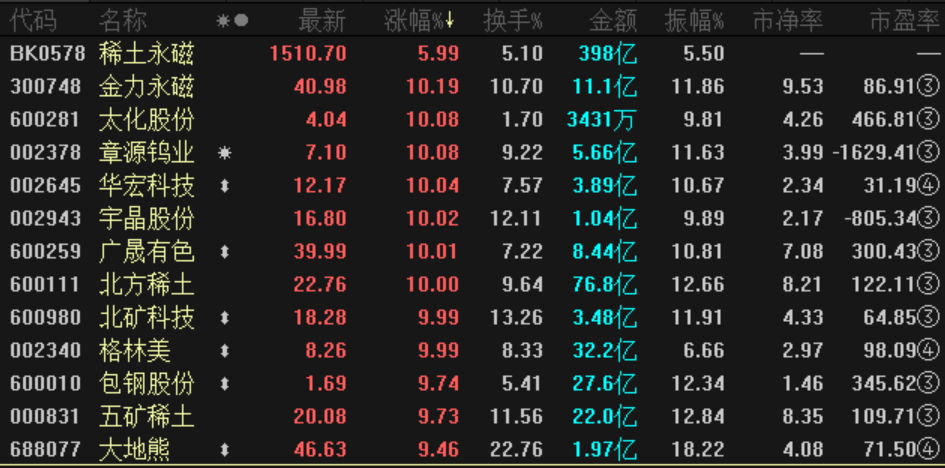 3月1日,稀土概念盘中现暴力拉升,wind稀土指数当日涨幅高达8.89%,板块内多只个股涨停。截至午后收盘,广晟有色、北方稀土、北矿科技、金力永磁收于涨停板,五矿稀土、大地熊涨幅均超过9%。港股中国稀土当日盘中一度暴涨27.16%至1.03港元,当日收涨17.28%。