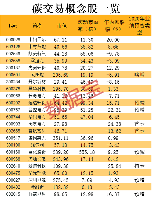 A股中,涉及碳交易概念的个股有20余只。概念股今日表现强势,其中中钢国际、中材节能涨停,凯美特气、雪迪龙、先河环保等涨超6%。
