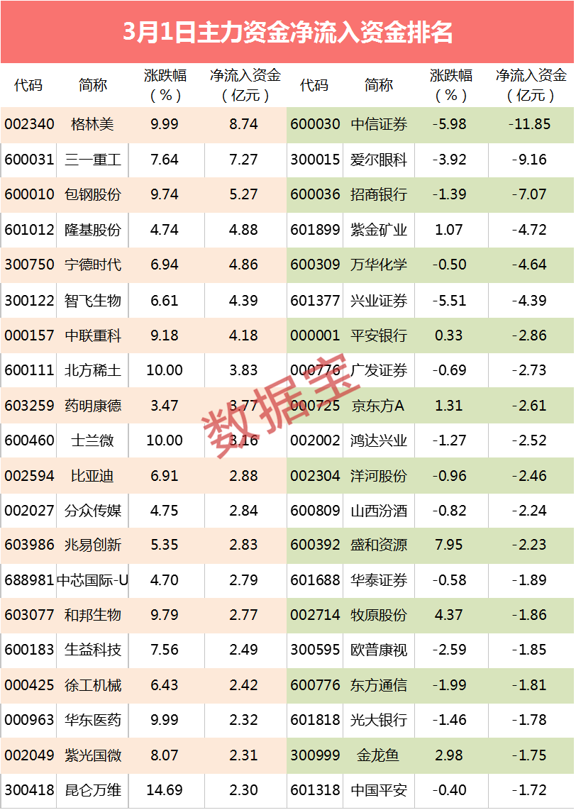 个股来看,共有61股主力资金净流入超亿元。格林美股价涨停,资金净流入8.74亿元居首。上周五,公司发布一季度业绩预告,预计2021年一季度实现归属于上市公司股东的净利润约2.42亿元至2.97亿元,较上年同期增长120%至170%。公告称,2021年公司三元前驱体和四氧化三钴的全年订单应接不暇,产能大释放。盘后数据显示,深股通买入3.92亿元并卖出8532万元,两机构席位合计买入2.61亿元,一机构席位卖出2453万元。