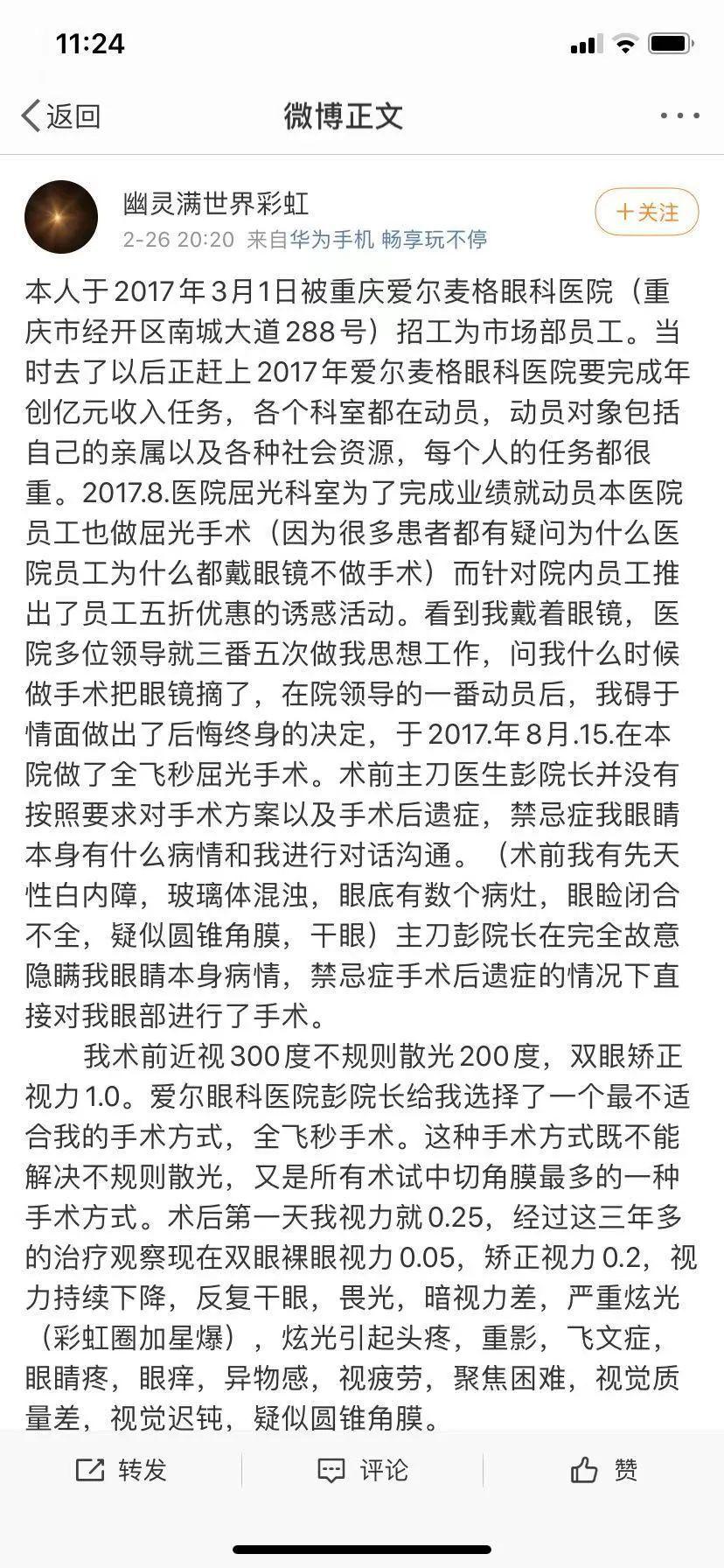 “幽灵满世界彩虹”认为,重庆麦格在自己视力严重受损一事上负有不可推卸的责任,目前正在持续维权。记者注意到,2月27日,同在爱尔眼科进行手术不幸出现不良结果的艾芬医生也转发前述微博内容,为这位爱尔眼科前员工声援。