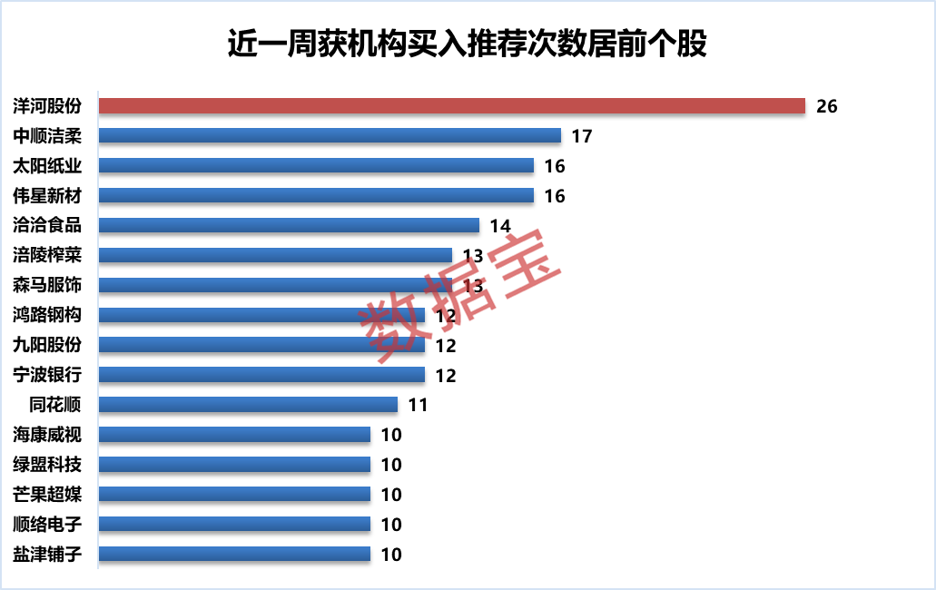 从个股来看,获机构买入推荐不少于10次的公司共16家。其中,洋河股份获买入推荐次数最多,有26次。获机构买入推荐次数较高的个股还有中顺洁柔、太阳纸业、伟星新材、洽洽食品等。