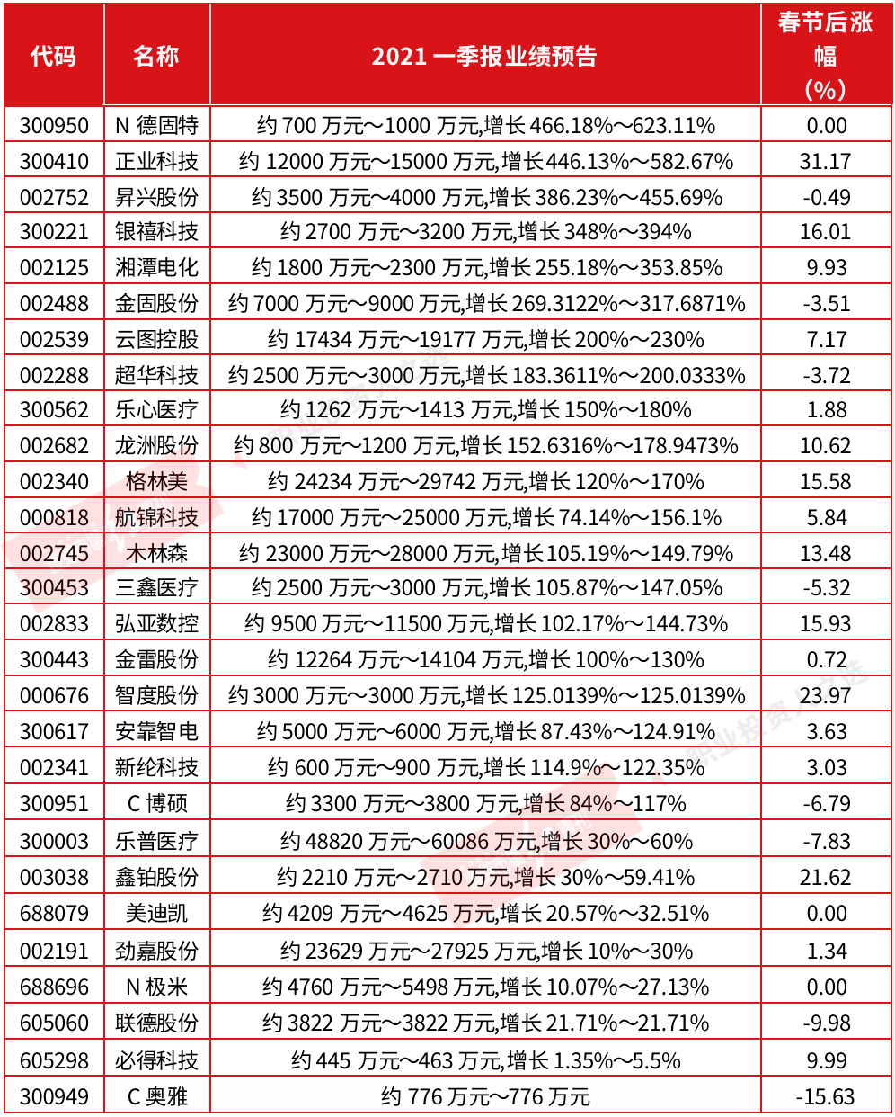 具体到个股,本周新上市的德固特增长预期最为彪悍,虽然盈利金额只有700万元~1000万元不算起眼,但因去年同期新冠疫情影响,公司净利润是出现小幅亏损的,随着之后经营的逐步恢复,终于在今年首季业绩成功扭亏,预计同比大幅增长466.18%~623.11%。紧随其后的是正业科技,公告称,今年一季度预计实现净利润1.2亿元~1.5亿元,同比预增446.13%~582.67%,不过值得注意的是,公司在2020年12月出售了部分房产,该部分房产于今年1月完成过户登记手续,仅非经常性损益就对公司贡献了近亿元的净利润,若剔除此部分非经常性收益,则公司盈利额将降至2000万元~5000万元。