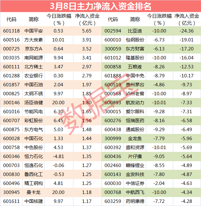 沪指3月8日下跌2.3%,主力资金全天净流出625.92亿元。其中,中小板主力资金净流出134.06亿元,创业板主力资金净流出124.79亿元,沪深300成份股主力资金净流出320.91亿元。