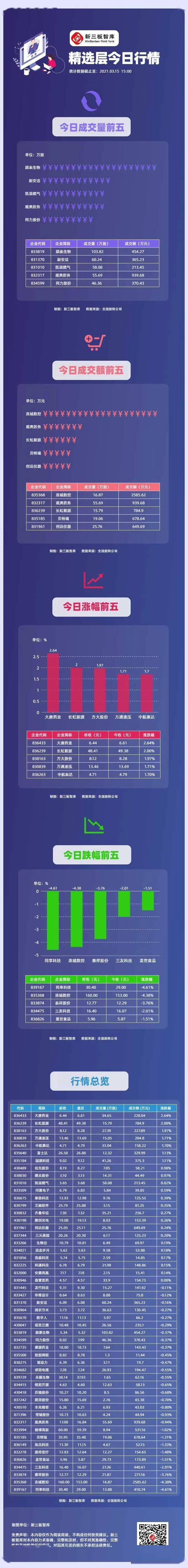 精选层开板后,新三板企业交易趋向活跃。为了帮助投资者便捷获知市场行情,了解精选层每日企业异动,新三板智库每日梳理精选层交易行情及市场动态,便于投资者及时把握投资机会。