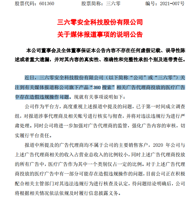 针对中央电视台3.15晚会报道的关于医疗广告代理商造假违规操作的问题,三六零今早也最新回应了。公司公告称,关注到有关媒体报道称公司旗下产品“360搜索”相关广告代理商投放的医疗广告中存在造假违规操作问题。