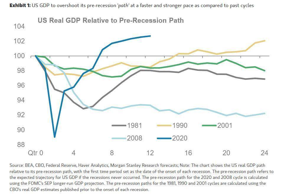 大摩的核心观点是, 受货币政策和财政政策的影响,从2021年第三季度开始,预计美国GDP将超过经济衰退前的水平,从而导致通货膨胀率不可避免地持续走高,并可能会突破2.5%,从而颠覆美联储政策,给金融市场带来动荡。