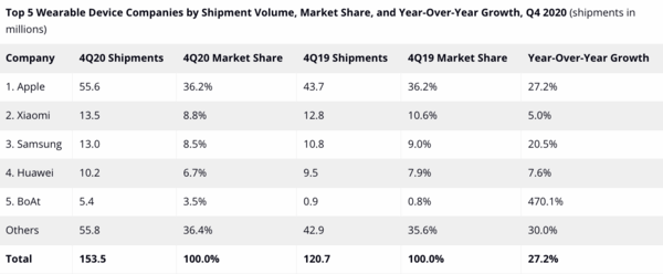 第四季度,苹果可穿戴设备(AirPods、Apple Watch)出货量为5560万部,同比增长27.2%,领跑整个市常小米以1350万部的出货量排名第二,市场份额为8.8%。三星和华为分列第三、第四,出货量分别为1300万部和1020万部,市场份额分别为8.5%、6.7%。仅在印度运营的BoAt出货量为540万台,排名进入前五。