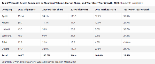 另外,2020年全年可穿戴设备出货量排名前五的厂商依次是苹果、小米、华为、三星、Fitbit,出货量分别为1.514亿部、5070万部、4350万部、4000万部、1290万部。