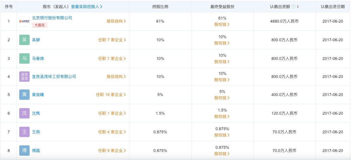 天眼查资料显示,云南西山北银(北京银行)村镇银行成立于2017年6月,注册资本为8000万元,法定代表人为陈树强,北京银行持股61%,为该银行的大股东。