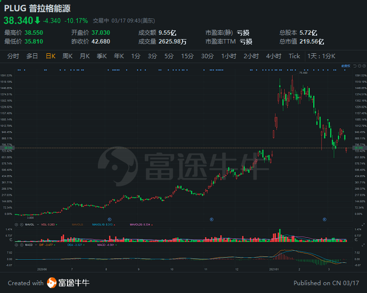 富途资讯3月17日消息,普拉格能源今日股价大跌,截至发稿,跌10.17%,报38.34美元,暂成交9.55亿美元,最新总市值219亿美元。