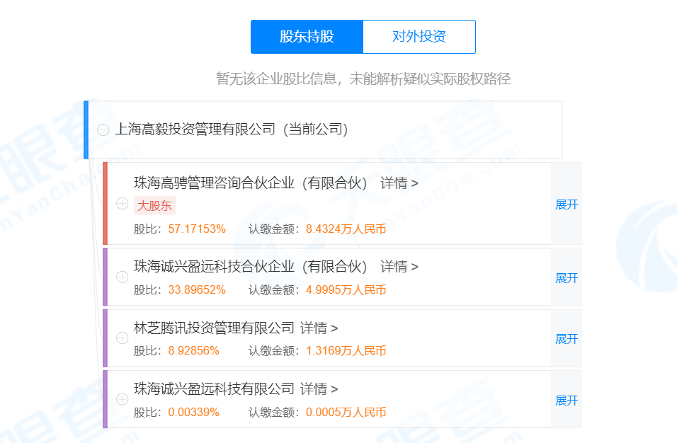 上述消息,主要源于一条工商变更信息。天眼查数据显示,近日,上海高毅投资管理有限公司(下称:高毅投资)发生工商变更,新增林芝腾讯投资管理有限公司、珠海高骋管理咨询合伙企业(有限合伙)为股东,同时,法定代表人由张海燕变更为韩海峰。此次,腾讯产业投资基金有限公司的全资子公司-林芝腾讯投资入股1.3万元,高毅投资注册资本从5万增至约14.75万,增幅约195%。