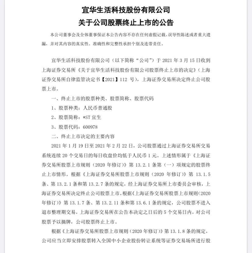 因连续20个交易日的收盘价格均低于人民币1元,*ST宜生和*ST成城成为首批退市新规下的面值退市企业。