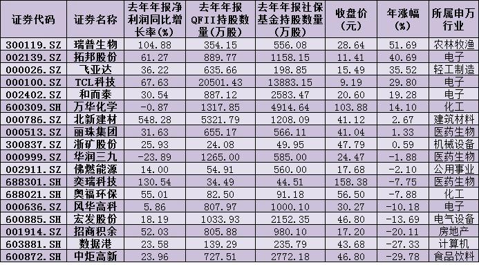 进一步梳理发现,共有18家上市公司前十大流通股股东中同时出现社保基金和QFII身影。
