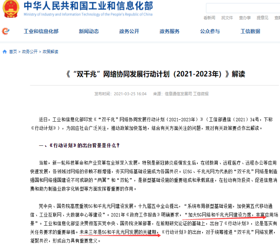 工信部3月25日印发《“双千兆”网络协同发展行动计划(2021-2023年)》,计划用三年时间,基本建成全面覆盖城市地区和有条件乡镇的 “双千兆”网络基础设施,实现固定和移动网络普遍具备 “千兆到户”能力。