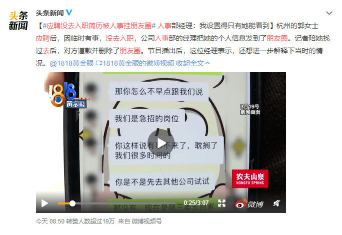 该HR则表示这个岗位是急招,说她“一点诚信都没有”还将她的信息发到了朋友圈,并配文: