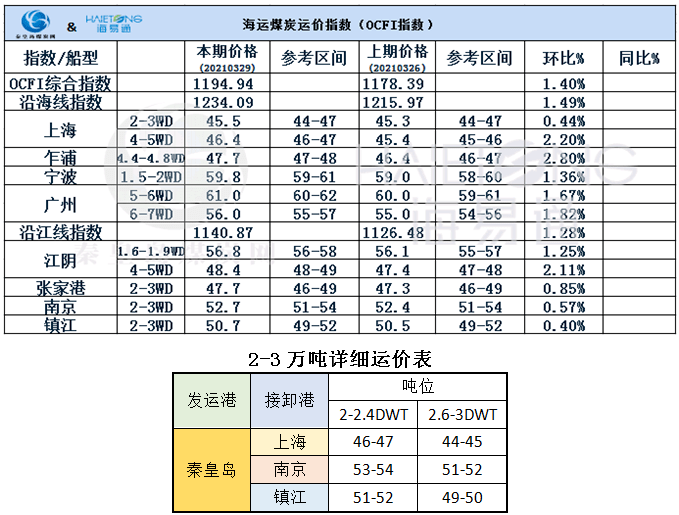 3月29日 周一 今日海运煤炭运价指数呈小幅上涨趋势。近期北港煤炭市场观望情绪持续升温,市场捂货惜售,今日动力煤期货2105合约上午既涨停,可预见此次期货涨停将再一次带动港口煤价上涨;同时产地煤价受周边建材、化工煤炭需求增加影响开启了连涨模式。下游电厂仍处于煤炭需求淡季,高煤价使其保持对市场煤的观望,市场煤下水需求较弱,但船舶运力需求受其他终端刚需煤炭、非煤货盘支撑,今日运价小幅上涨。