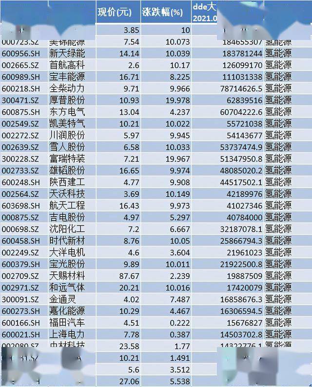注:近5日大单净额超过1000万元的氢能源概念股