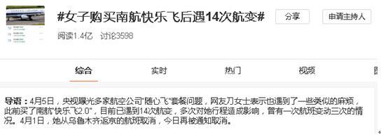 《经济参考报》记者了解到,4月6日,话题“女子购买南航‘快乐飞’后遇14次航变”跃上微博热搜。截至发稿时,该话题实时阅读量已突破1.4亿。