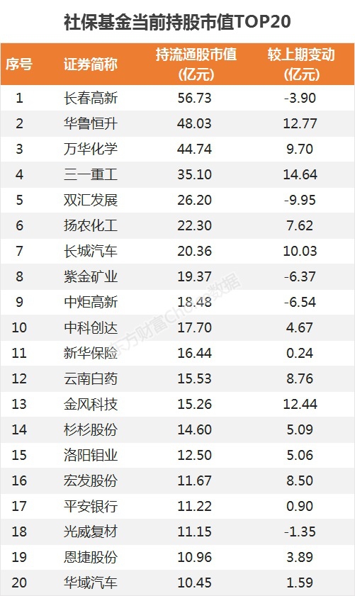 社保基金持仓市值TOP20