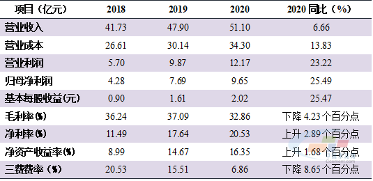 截止2020年末,公司总资产 82.66亿元,净资产66.66 亿元。20 20年公司实现营业收入51.10亿元,利润总额12.41亿元,归属于母公司的净利润9.65亿元。
