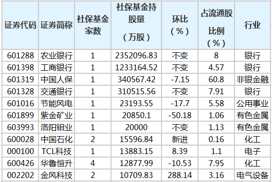从持股比例看,社保基金持有比例最多的是中国人保,持股量占流通股比例为60.8%。持股数量方面,社保基金持股数量在1亿股以上的共有12只,社保基金持股量最多的是农业银行,共持有235.21亿股,工商银行、中国人保等紧随其后。