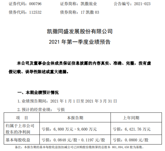 挖贝网4月12日,凯撒旅业(000796)近日发布2021年第一季度业绩预告,预计业绩同比亏损增加。报告期内归属于上市公司股东的净利润亏损6,800万元–9,600万元,上年同期亏损6,421.76万元,较上年同期亏损增加;基本每股收益亏损0.0848元/股–0.1197元/股。