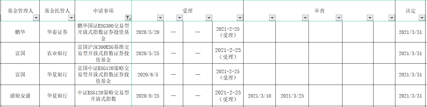 4月16日,资本邦了解到,近日,全市场首批ESG主题ETF获批,浦银安盛基金等3家基金公司获得头奖,该批基金将于收到批文后6个月内进行公开募集。值得一提的是,浦银安盛中证ESG120策略ETF是2020年8月申报,同期浦银安盛也申报了ESG责任投资混合型基金,后者已于2021年3月16日成立。