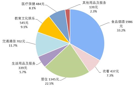 此外,人均生活用品及服务消费支出339元,增长19.9%,占人均消费支出的比重为5.7%;人均交通通信消费支出702元,增长16.0%,占人均消费支出的比重为11.7%;人均教育文化娱乐消费支出545元,增长55.7%,占人均消费支出的比重为9.1%;人均医疗保健消费支出484元,增长16.1%,占人均消费支出的比重为8.1%;人均其他用品及服务消费支出139元,增长24.2%,占人均消费支出的比重为2.3%。