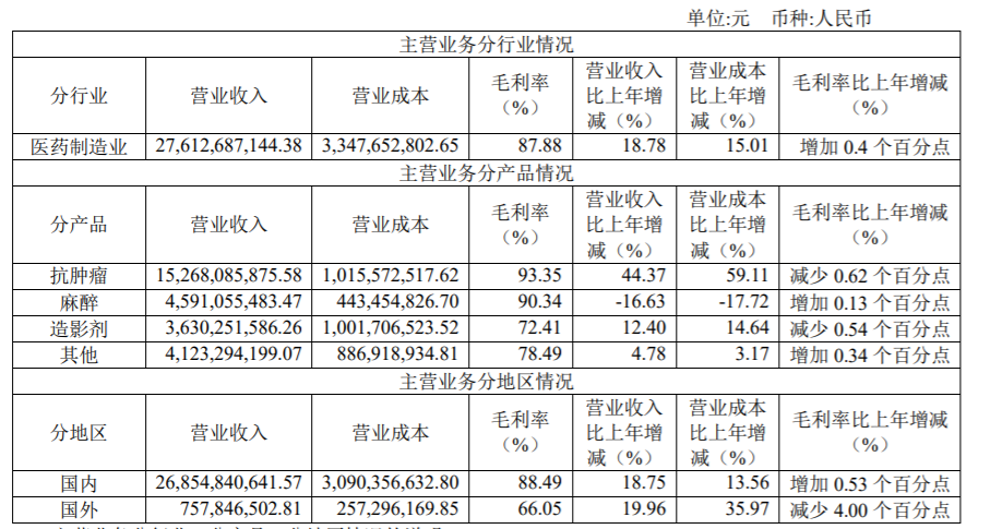 2020年,恒瑞医药实现主营业务收入增长 18.78%,从产品板块划分来看,肿瘤药产品营业收入增长最快,达到 44.37%,造影剂产品营业收入增长 12.40%,麻醉业务则降低了16.63%。