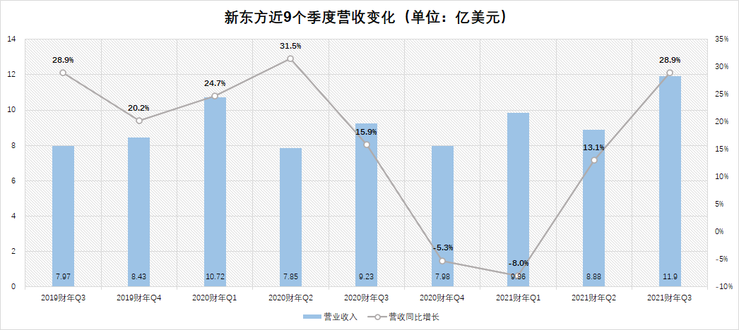 2021财年Q3,新东方净营收11.9亿美元,市场预期为11.41亿美元,同比增长29%、超出市场预期。值得注意的是,这是新东方自上市以来的历史单季新高。在增速上,Q3的增速已达到疫情前的水平,看起来已经回归快速增长的通道。