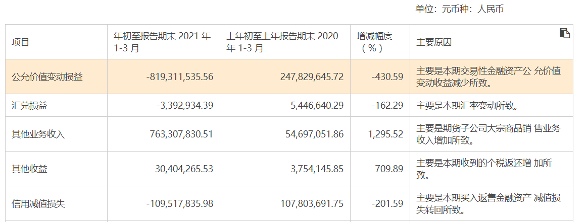 此外,报告显示,公司一季度公允价值变动亏损8.19亿元,较去年同期下降430.59%,公司解释称本期交易性金融资产公允价值变动收益减少所致。