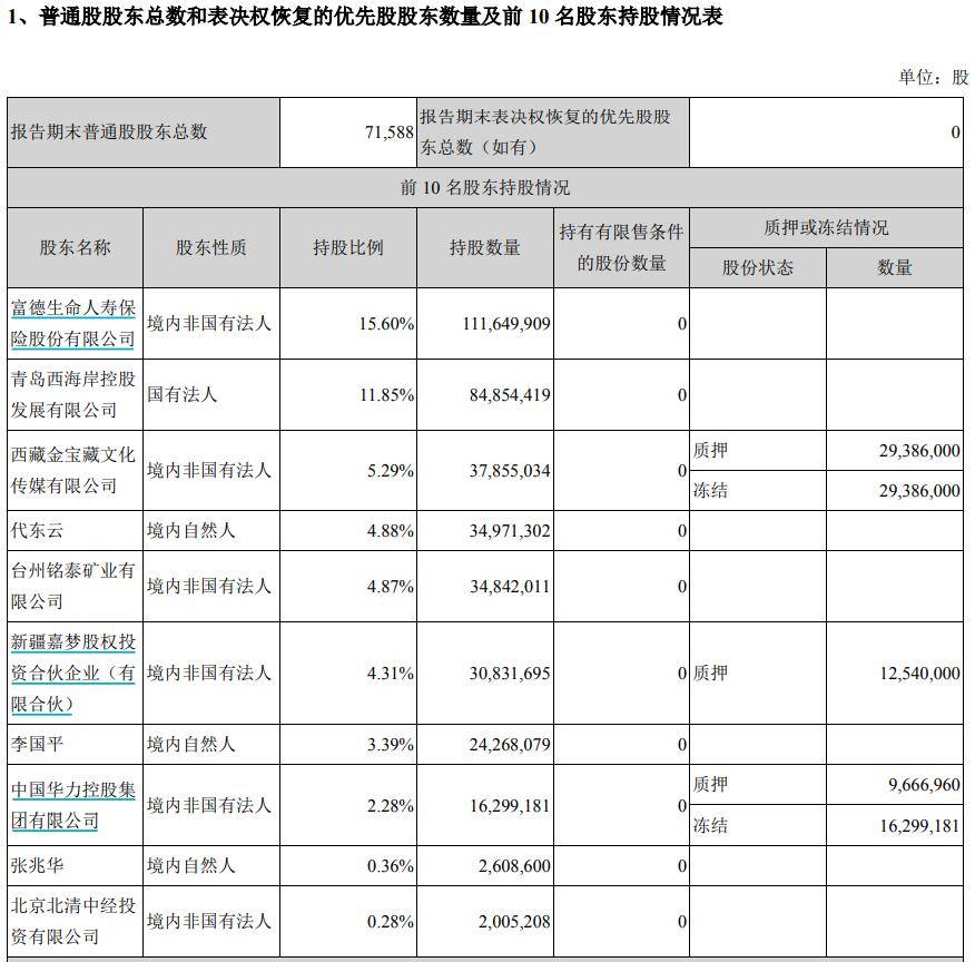 一季报显示,富德生命人寿保险股份有限公司为北京文化大股东。持股比例15.60%,此外,西藏金宝藏文化传媒有限公司持股5.29%,股份状态处于质押和冻结状态。新疆嘉梦股权投资合伙企业(有限合伙)持股4.31%,股份状态处于质押状态。中国华力控股集团有限公司持股2.28%,股份状态处于质押状态。
