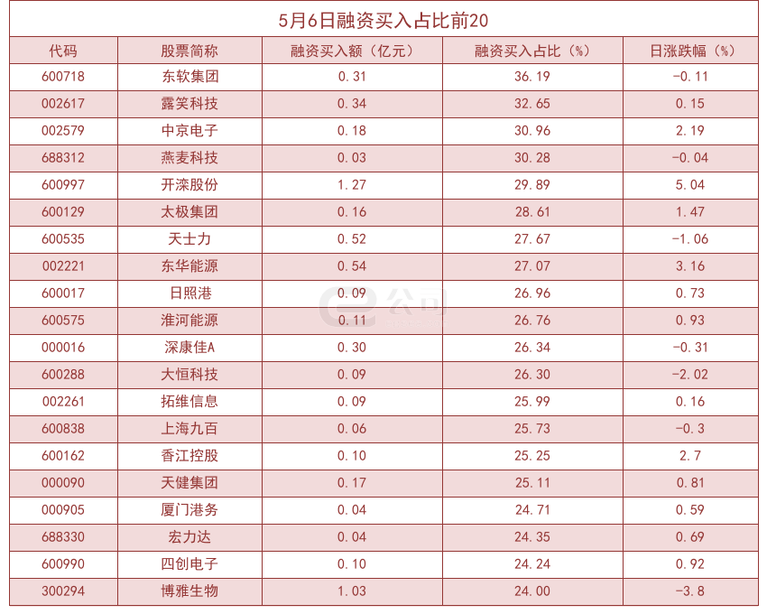 个股方面,沪深两市共有1963只个股有融资资金买入。从融资买入额占当日总成交金额比重来看,共有67只股票融资买入额占比超20%,其中东软集团(36.19%)、露笑科技(32.65%)、中京电子(30.96%)排名前三。