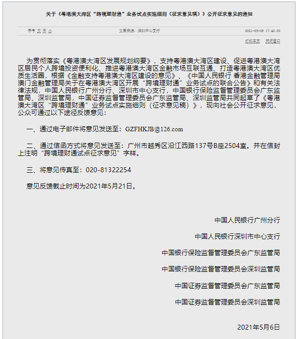 5月7日,资本邦了解到,昨日,广东六家“一行两局”金融监管机构联合发布通知,就《粤港澳大湾区“跨境理财通”业务试点实施细则(征求意见稿)》公开征求意见。