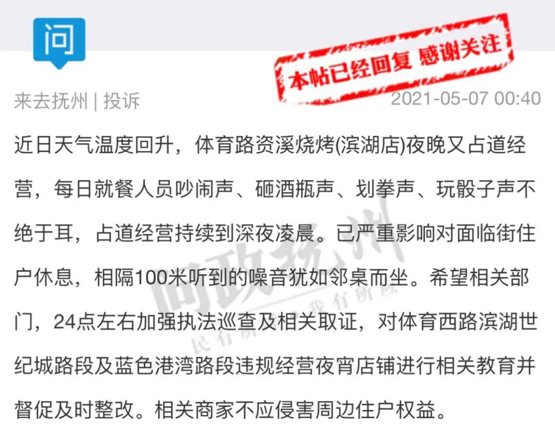 抚州体育路资溪烧烤(滨湖店)占道扰民 影响住户休息被投诉